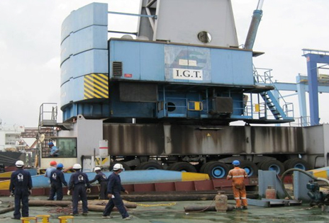 India Gateway Terminal Pvt. Limited (DP World, Cochin) awarded a turnkey project to LOTS-India, to relocate 2 Nos. Mobile Harbour Cranes (MHC) and 4 Nos. Rubber Tyre Gantry (RTG) from their old facility at Rajiv Gandhi container Terminal (RGTC) to their new facility at International Container Transhipment Terminal (ICCT) at Vallarpadom. The weight of each MHC was 415 MTs and that of the RTG was 135 MTs. The challenge was to shift these equipments without dismantling. LOTS-India mobilised Tug and Barge combination from Mumbai and successfully carried out the operation in 9 days.